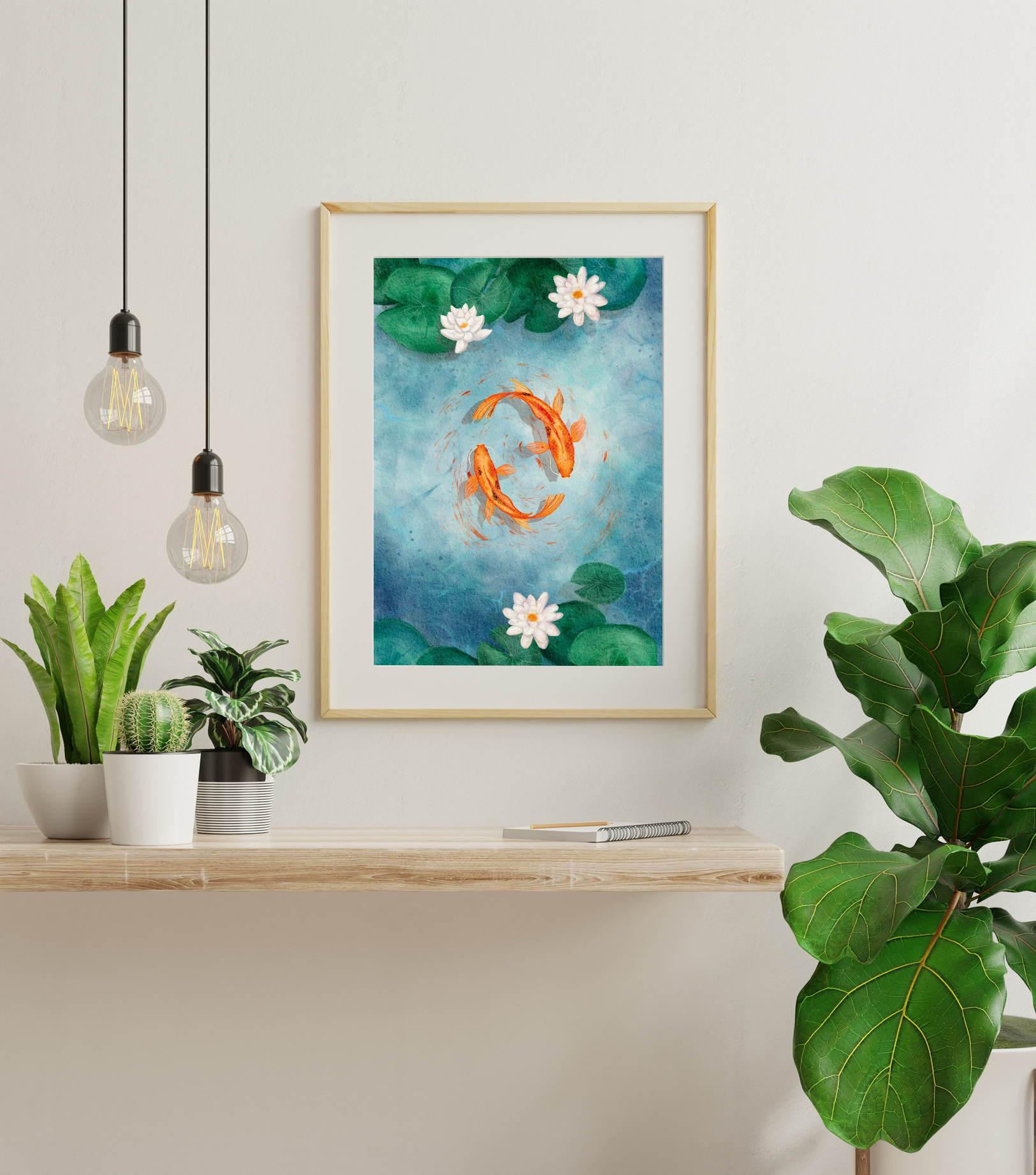 Art print van een aquarel schildering van koi vissen met waterlelies.