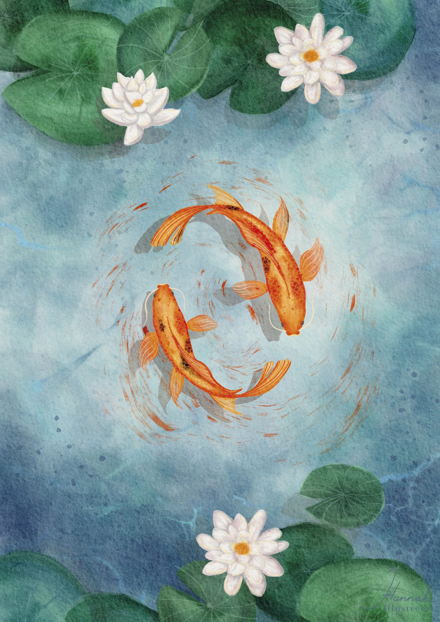 • Art print van een aquarel schildering van koi vissen met waterlelies.