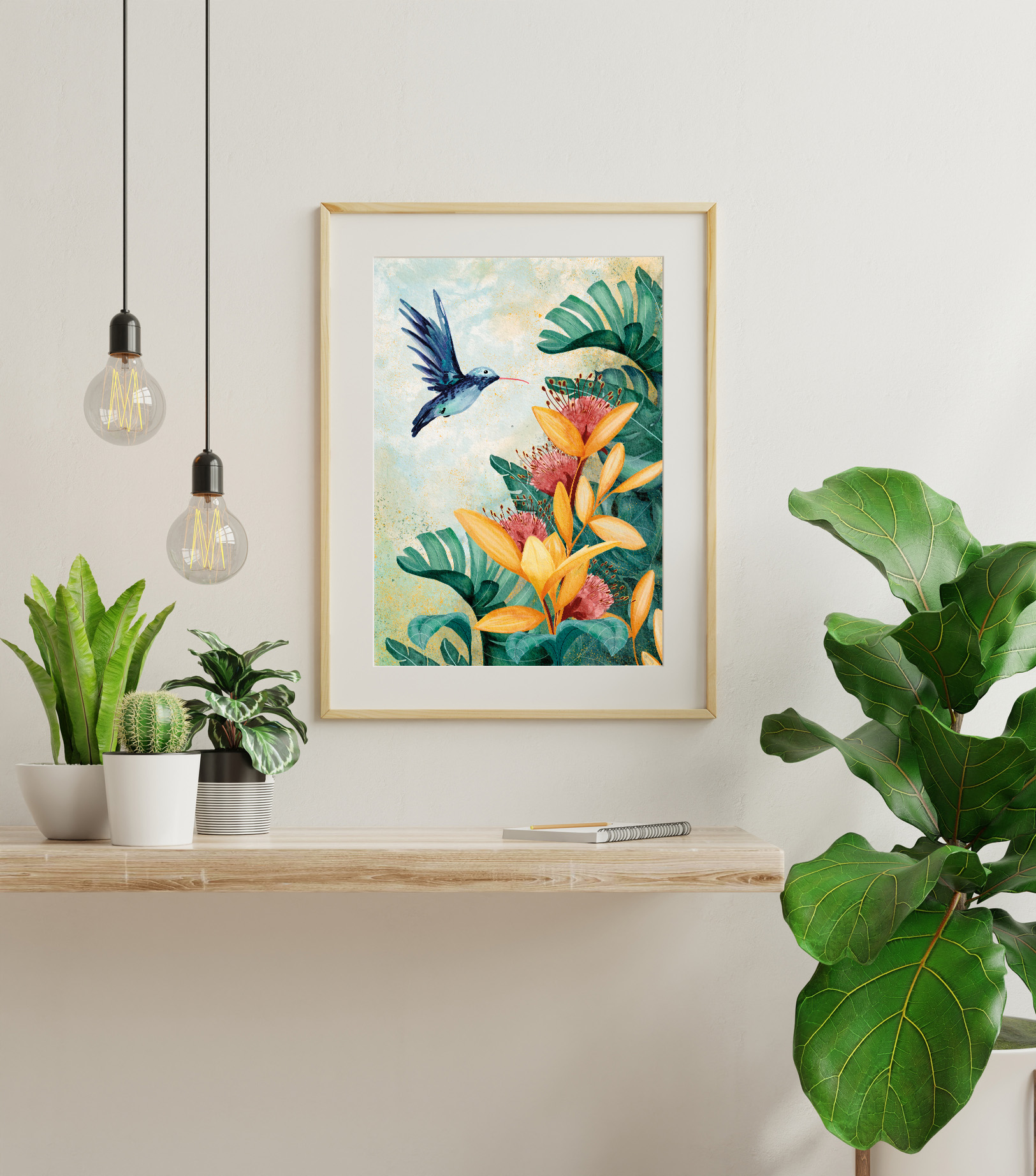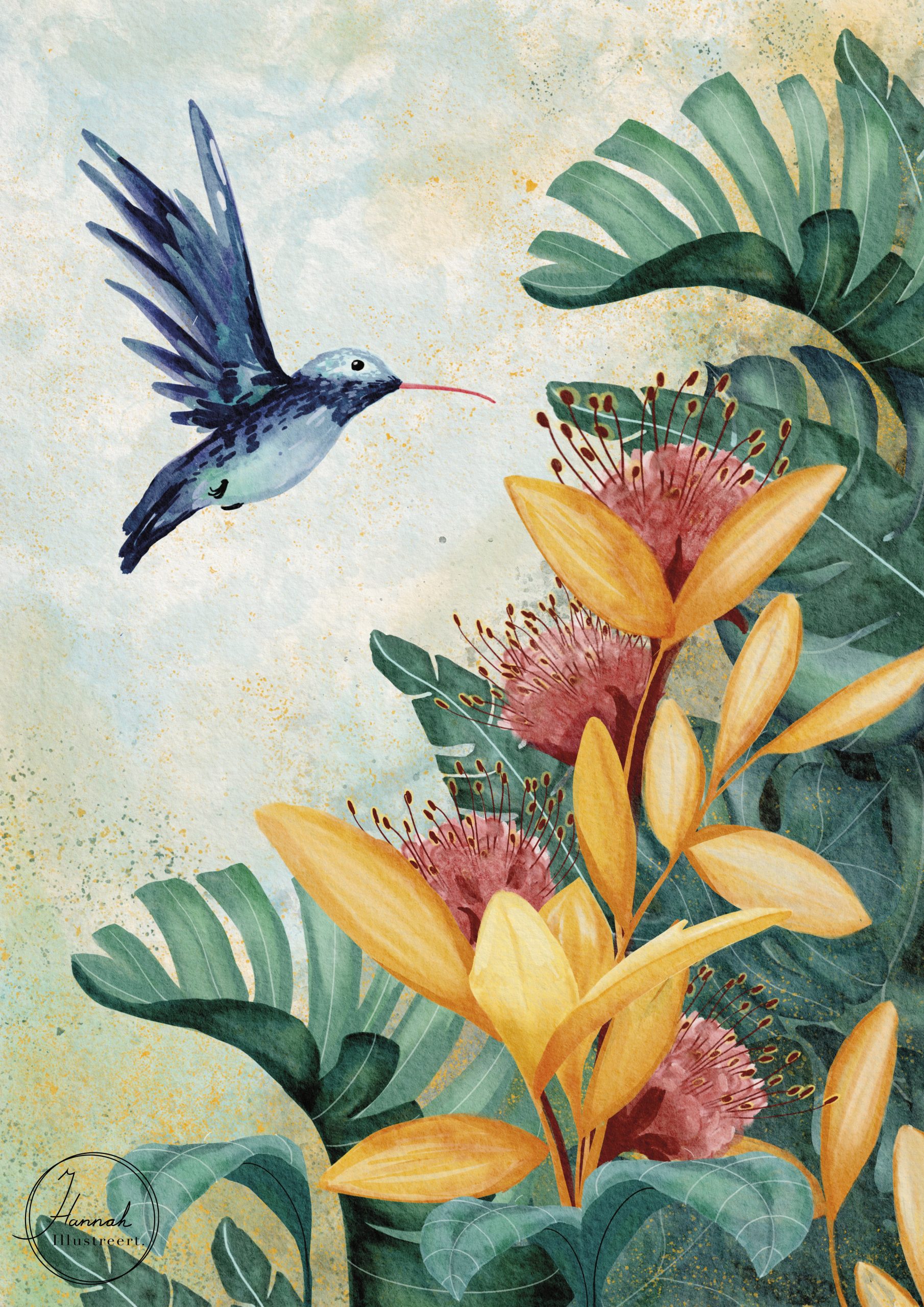 Art print van een aquarel schildering van een kolibrie met tropische bloemen.