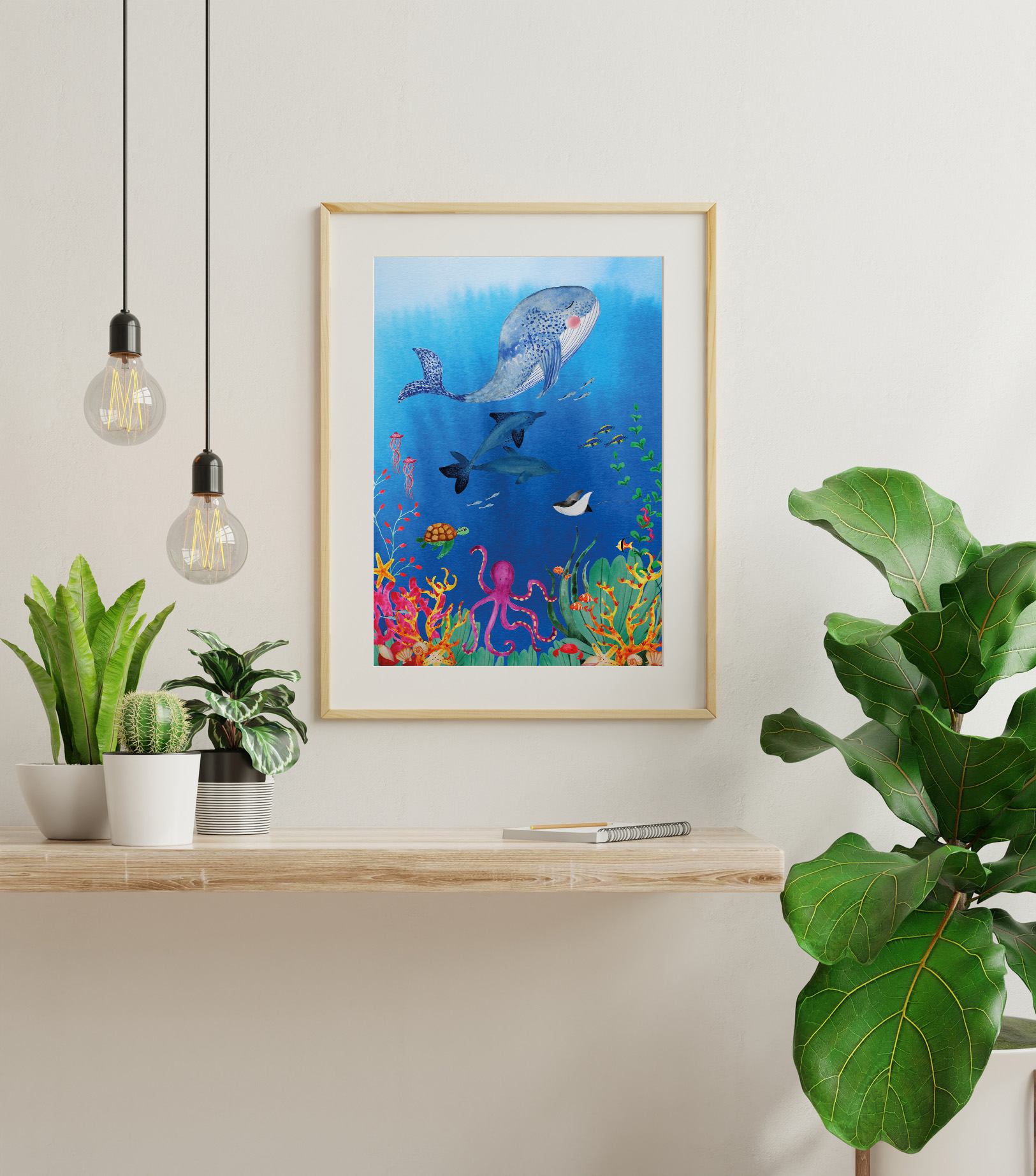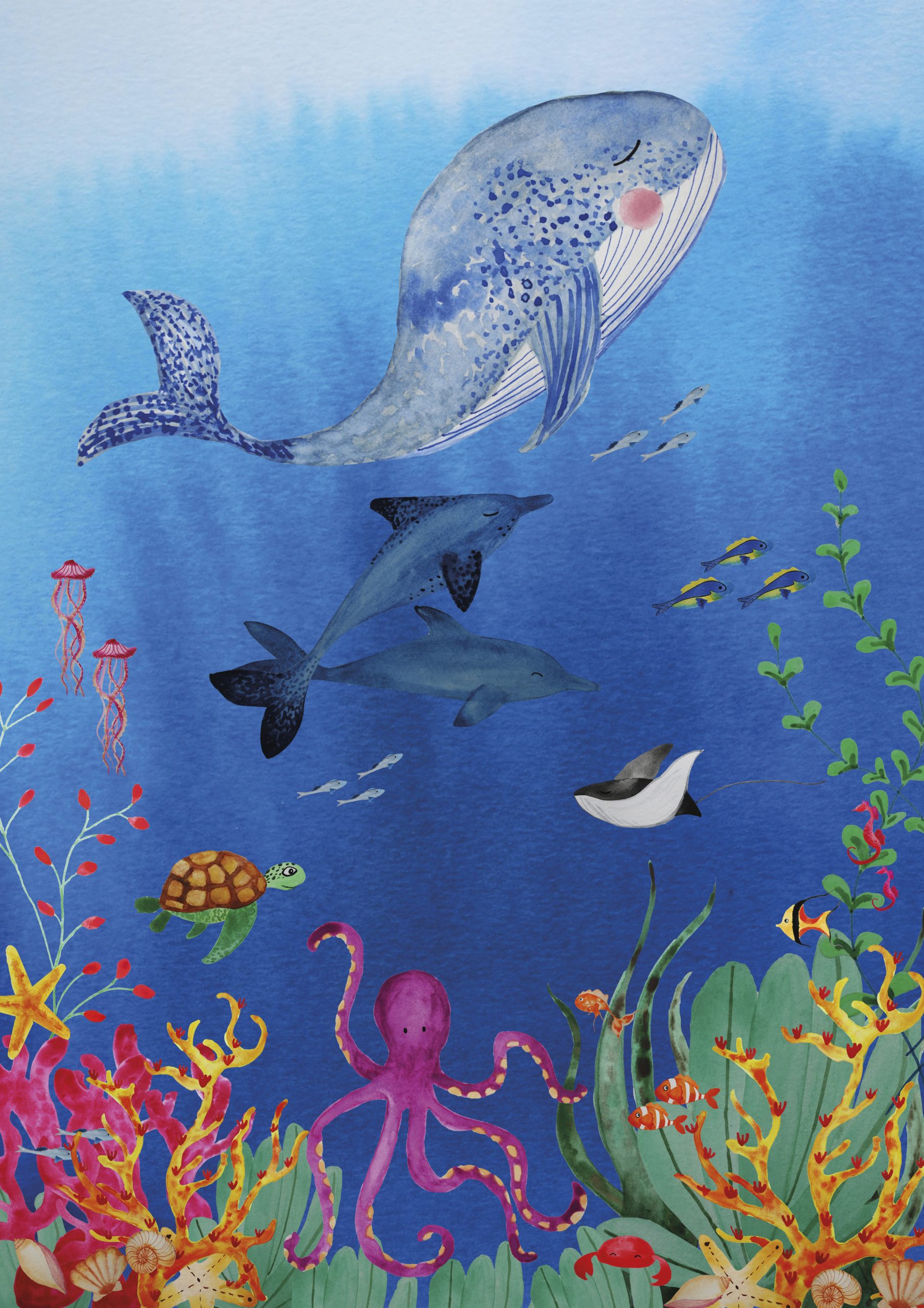 • Art print van een aquarel schildering van een onderwaterwereld met zeedieren.