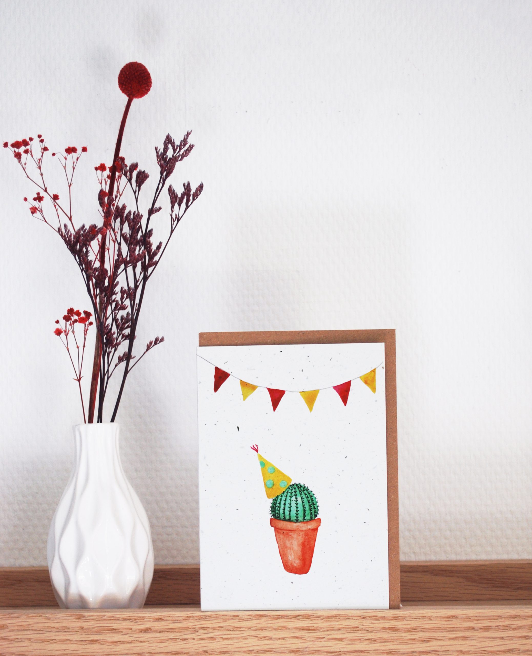 Duurzaam wenskaartje gedrukt op gerecycled papier gemaakt met tomatenplantvezels.